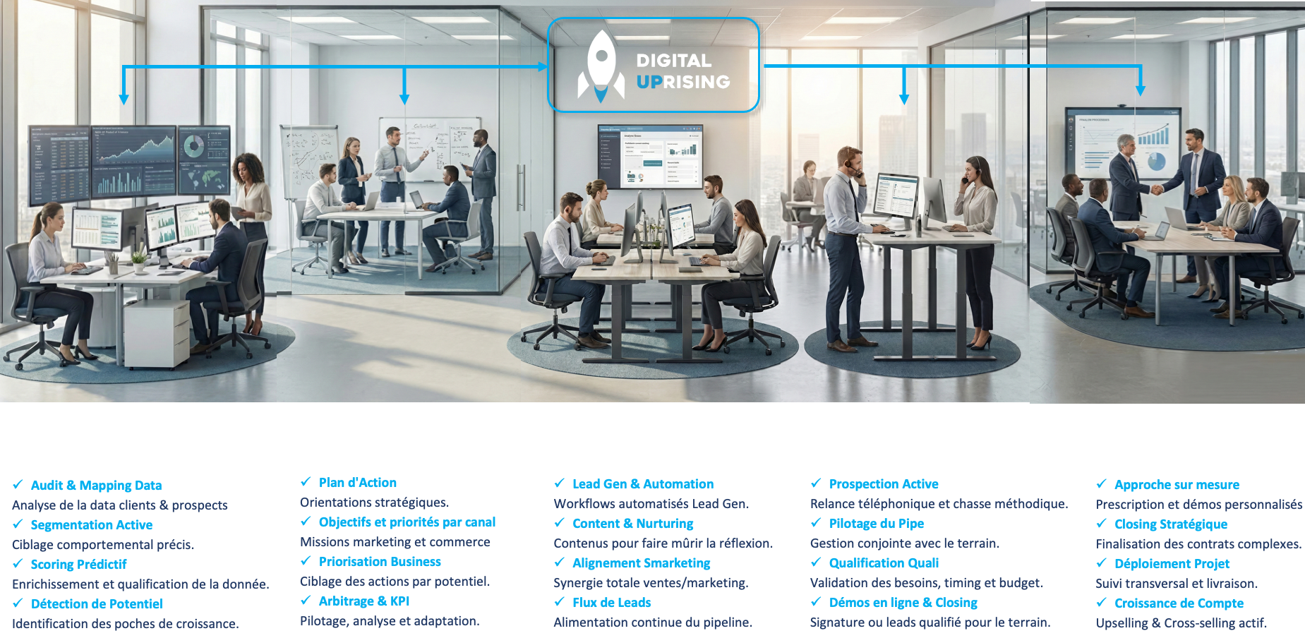 At Digital UPrising, we act as a "scout team" for your sales force. We handle the entire upstream process (prospecting, qualification, organization) to deliver opportunities directly to your sales representatives. The result: they spend less time on the phone or in the car, and more time closing deals with clients.